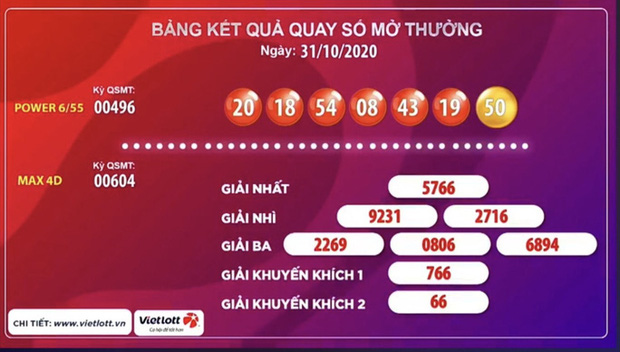 Tờ vé số Power 6/55 trúng giải Jackpot 1 có 6 cặp số 20-18-54-08-43-19 trùng với kết quả quay số. Vé này được phát hành từ điểm bán hàng có địa chỉ 430 đường Đại Mỗ, quận Nam Từ Liêm, Hà Nội, trực thuộc đại lý Mega Billions - Hà Nội.