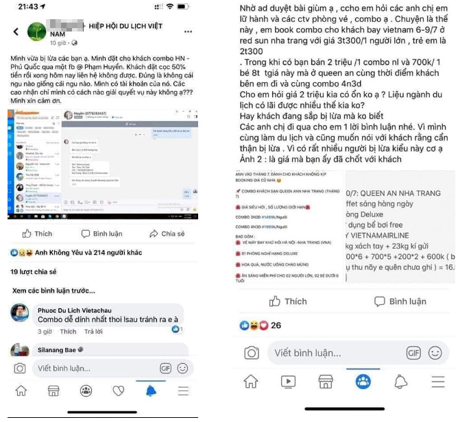 Cảnh báo trên một group (nhóm) chuyên về du lịch cách đây mấy hôm, chị Q.N. (đề nghị giấu tên), thông báo vừa bị lừa khi đặt combo vé máy bay, phòng khách sạn qua facebook @Phạm Huyền là thành viên của nhóm này. Khách đã đặt cọc 50% số tiền nhưng sau đó không liên lạc được với chủ facebook.