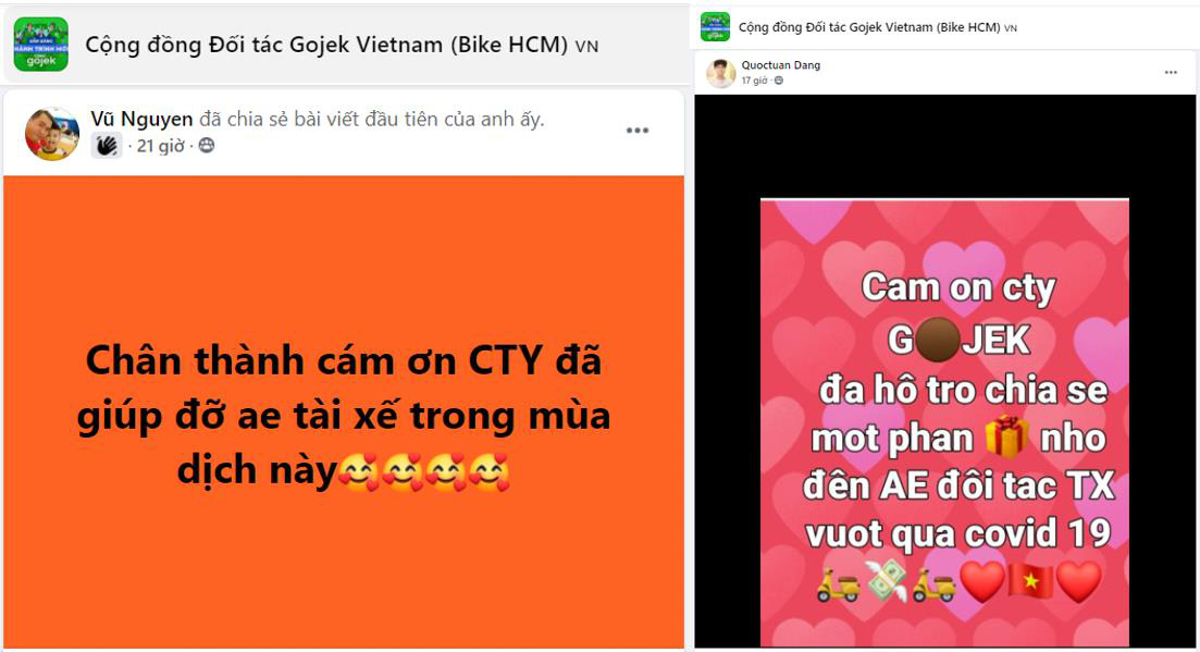 Khoản hỗ trợ tiền mặt, từ 200 nghìn đến 400 nghìn, được chuyển trực tiếp vào ví điện tử của những đối tác tài xế có hoạt động trên nền tảng Gojek trước thời gian giãn cách xã hội ở cả hai thành phố. Các đối tác tài xế trên 55 tuổi - những người có xu hướng gặp trở ngại về kinh tế hơn trong thời gian giãn cách - sẽ nhận được 400 nghìn đồng nếu ở Hà Nội, và 350 nghìn đồng nếu ở TP.HCM. Tất cả các đối tác tài xế đủ điều kiện khác cũng sẽ nhận được khoản hỗ trợ tùy thuộc vào địa bàn và tình trạng kinh tế.