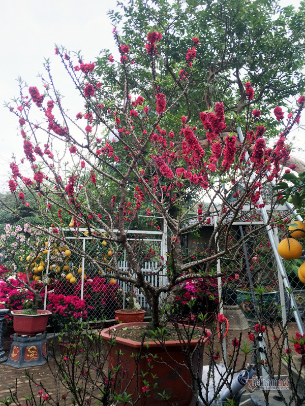Đáng chú ý, anh Cường còn sở hữu cây đào thất thốn 40 năm tuổi, cao khoảng 1,6 mét, có giá cho thuê lên đến 50 triệu. Đây cũng là cây độc nhất vô nhị tại vườn nhà anh, sai hoa, cho bông nở chum chím thành từng chùm dày màu đỏ thẫm, rất hợp với không khí ngày Tết.