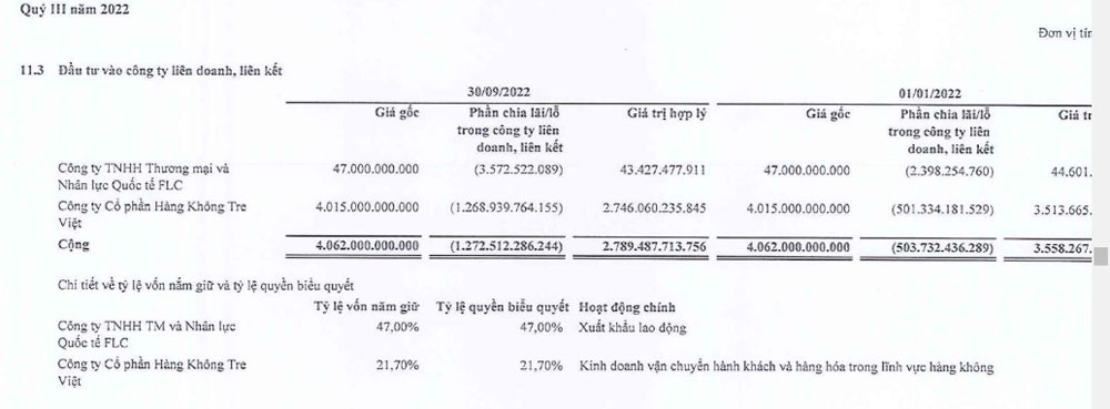 Theo báo cáo tài chính hợp nhất quý III/2022 của Tập đoàn FLC, khoản đầu tư vào Bamboo Airways lỗ 1.269 tỷ đồng trên giá trị đầu tư gốc 4.015 tỷ đồng. Tới cuối năm 2021, FLC đã lỗ vì hơn 501 tỷ đồng vì khoản đầu tư này.