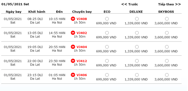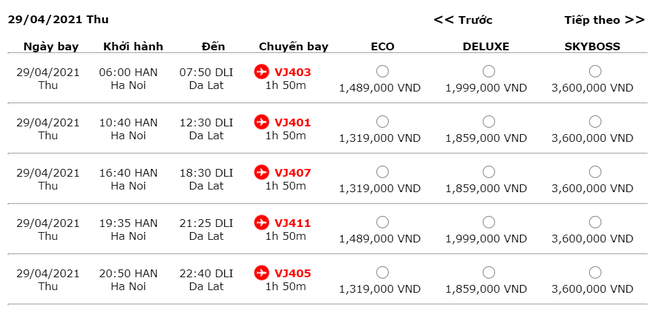 Trong khi đó, Vietjet vẫn còn khá nhiều khung giờ cho vé máy bay giá rẻ, di chuyển trong các ngày 27/4 - 2/5.