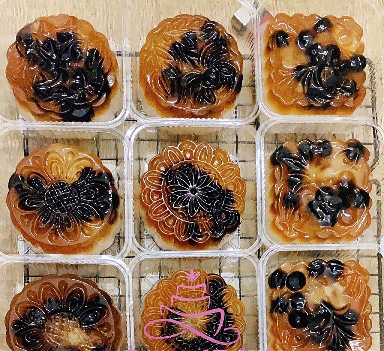 Bánh trung thu tỏi đen có lớp vỏ bánh màu đen từ tỏi đen xay nhuyễn nên rất mềm và thơm. Nhân bánh có nhiều hương vị như đậu xanh, đậu đen, thập cẩm gà quay... và được trộn lẫn cùng với những tép tỏi đen. Giá bánh trung thu tỏi đen khá cao, dao động từ 226.000-355.000 đồng/chiếc. (Ảnh: Eva).