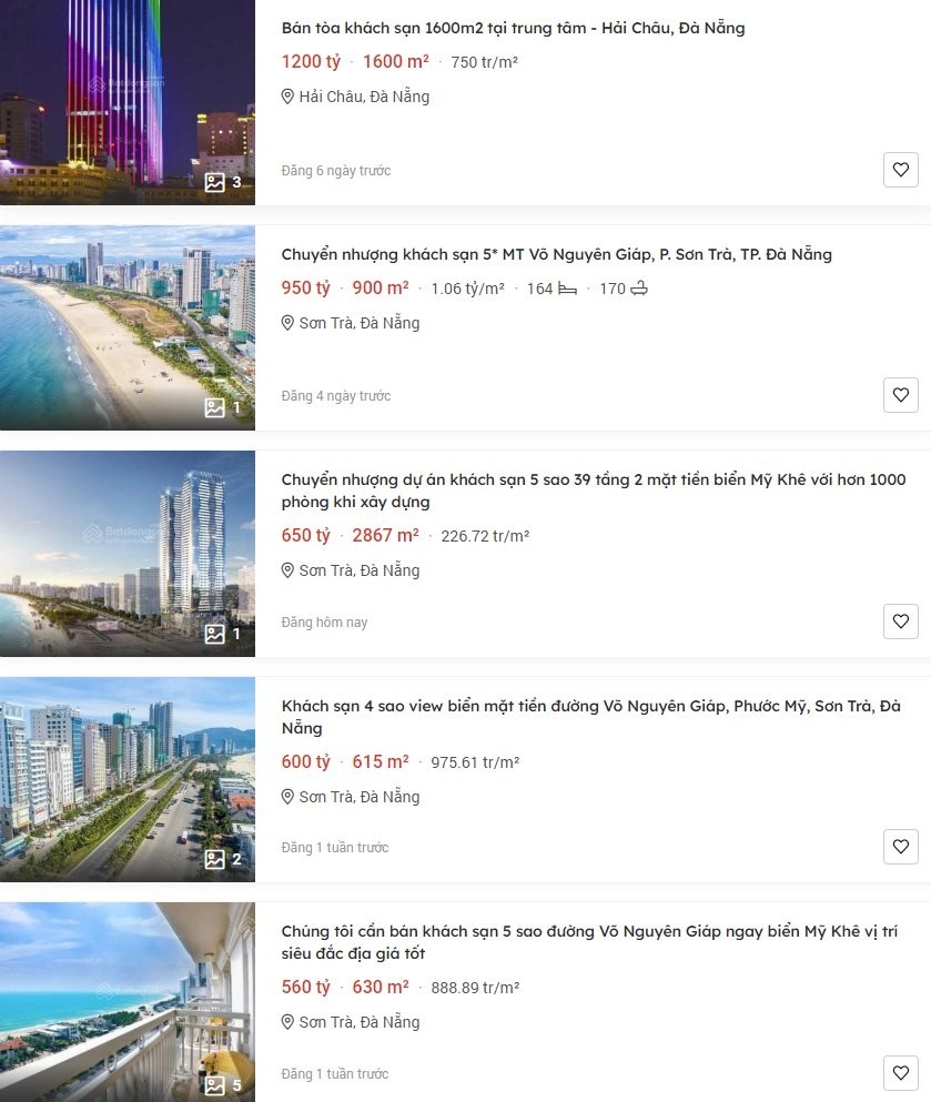 Mặc dù chuẩn bị bước vào mùa cao điểm du lịch, song nhiều khách sạn tại Đà Nẵng đang ồ ạt rao bán, thậm chí lượng bán khách sạn lúc này được đánh giá nhiều hơn khi chưa xuất hiện dịch bệnh. Các tòa khách sạn đang được rao bán hầu hết có mức giá từ vài trăm tỷ đến nghìn tỷ đồng. Do giá trị của các tòa khách sạn đều rất cao nên việc tìm kiếm khách mua cũng khá khó khăn.