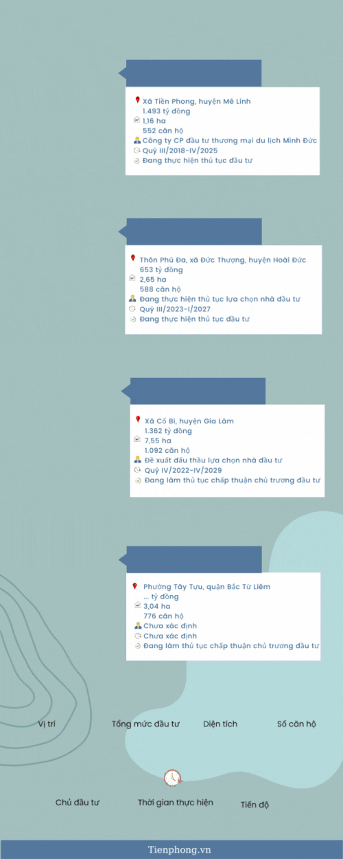 Dự án khu nhà ở Minh Đức (phần nhà ở xã hội tại ô đất CT) thuộc xã Tiền Phong (huyện Mê Linh); Dự án đầu tư xây dựng khu nhà ở xã hội Đức Thượng tại thôn Phú Đa (xã Đức Thượng, huyện Hoài Đức); Khu nhà ở xã hội kết hợp bãi đỗ xe tại xã Cổ Bi (huyện Gia Lâm); Dự án xây dựng nhà ở xã hội tại khu chức năng đô thị Tây Tựu tại phường Tây Tựu (quận Bắc Từ Liêm).