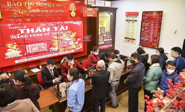 Chiều mùng 9 tháng hai âm lịch, tại hệ thống Bảo tín Minh Châu, quầy thanh toán, tư vấn đông kín khách. Cơn sốt mua vàng ngày Thần Tài dường như đến sớm hơn thường lệ. Các sản phẩm được quan tâm nhiều hơn là đĩnh vàng tài lộc, vỉ kim dần, vỉ thần tài, nhẫn tròn trơn,… Các sản phẩm chế tác riêng cho ngày Thần Tài chủ yếu có bản vị từ 1 chỉ, chế tác hình hổ, túi lộc, thỏi vàng, chữ may mắn. Để đảm bảo phòng dịch, hệ thống cửa hàng này đã phun khử khuẩn toàn bộ cơ sở trong ngày trước đó.