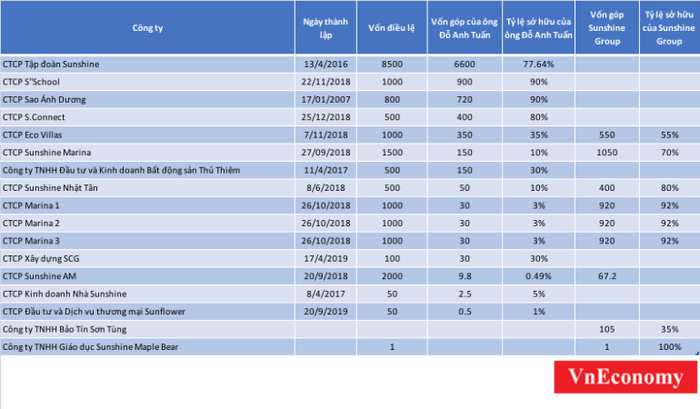 Thông tin mà VnEconomy có được, bên cạnh khả năng "tăng vốn" thần kỳ cho Sunshine Group, ông Tuấn còn gây bất ngờ với vai trò "khởi nghiệp" khi sáng lập hàng loạt công ty chỉ trong vòng 3 năm. Một báo cáo cho thấy, trong 3 năm qua (2016-2019), ông Tuấn giữ vai trò là người sáng lập/quản lý tại 22 công ty khác nhau.
