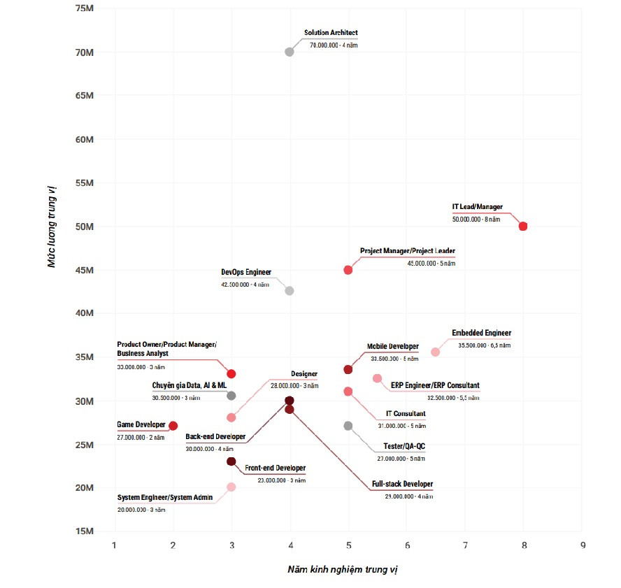 Đặc biệt, Solution Architect (kiến trúc sư giải pháp) đang là các chuyên gia IT được trả mức lương top đầu trong ngành. Theo như báo cáo, với kinh nghiệm làm việc từ 1-3 năm, các chuyên gia này đang được trả mức lương trung vị 70 triệu đồng/tháng; từ 3-5 năm kinh nghiệm, được trả 80 triệu đồng/tháng. Khoản tiền lương trên không bao gồm thưởng và các khoản phúc lợi. Đây cũng là nhóm nhân sự luôn có đòi hỏi cao về mức lương nhận được. Có tới 23,1% ý kiến khảo sát cho biết, họ sẽ nghỉ việc nếu mức lương đang được trả thấp hơn so với kỳ vọng.