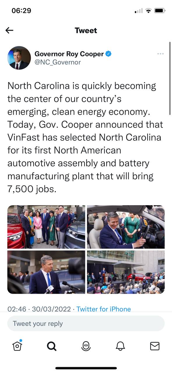 Ngay sau buổi lễ ký kết, Thống đốc bang Bắc Carolina Roy Cooper đã thông báo trên Twitter: "North Carolina đang nhanh chóng trở thành trung tâm của nền kinh tế năng lượng sạch, mới nổi của nước ta. Hôm nay thống đốc Cooper thông báo rằng VinFast đã chọn North Carolina để đặt nhà máy lắp ráp ô tô và sản xuất pin đầu tiên ở Bắc Mỹ, nơi sẽ mang lại 7.500 việc làm".