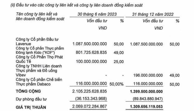 Mới đây, giá trị thương vụ đã được tiết lộ khi báo cáo tài chính quý II của Kido được công bố. Theo đó, đến 30/6/2023, số tiền Kido đầu tư vào Công ty CP Thọ Phát quốc tế là 100 tỷ đồng, tương đương tỷ lệ sở hữu 25%.