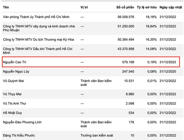 Cổ phiếu duy nhất ông Nguyễn Cao Trí đang nắm giữ là SGB (Saigonbank), với gần 580.000 đơn vị, tỷ lệ sở hữu là 0,188%. Tháng 1 năm nay, Saigonbank công bố thay đổi nhân sự hội đồng quản trị. Trong đó, ông Nguyễn Cao Trí là thành viên Hội đồng quản trị Saigonbank nhiệm kỳ 2019 - 2024, bị công bố “đương nhiên mất tư cách, không còn là thành viên hội đồng quản trị kể từ ngày 19/1”. Trước đó, tháng 6/2021, ông Nguyễn Cao Trí mua vào gần 580.000 cổ phiếu SGB và tham gia vào hội đồng quản trị Saigonbank sau 4 tháng.
