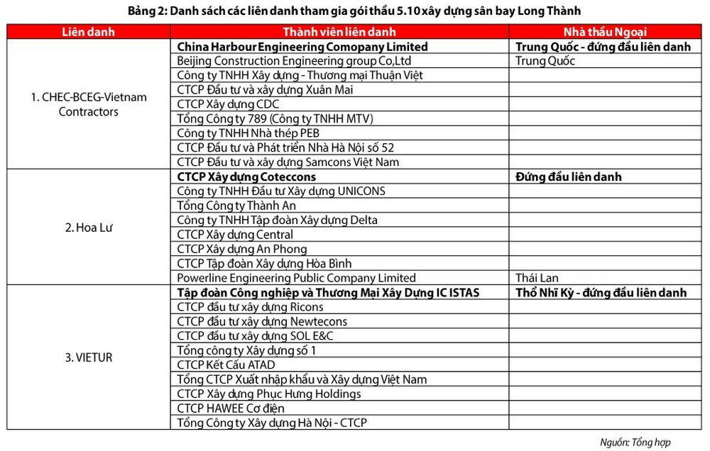 Theo thông tin chúng tôi có được, biên bản mở thầu gói thầu 5.10 trị giá 35.000 tỷ đồng, thi công xây dựng nhà ga hành khách của sân bay Long Thành giai đoạn 1 đã hé mở những thông tin dự thầu của 3 liên danh đã nộp hồ sơ gồm Liên danh CHEC-BCEG-Vietnam Contractors, Liên danh Hoa Lư và Liên danh VIETUR.