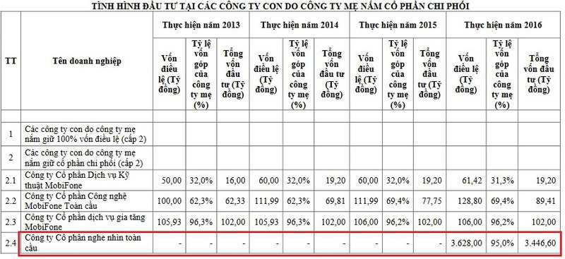 Báo cáo đánh giá năm 2016 của MobiFone chỉ thể hiện tổng vốn đầu tư vào AVG là 3,446 tỷ đồng