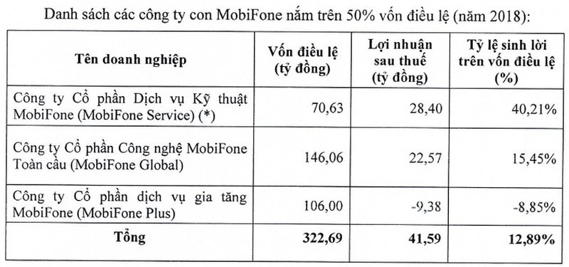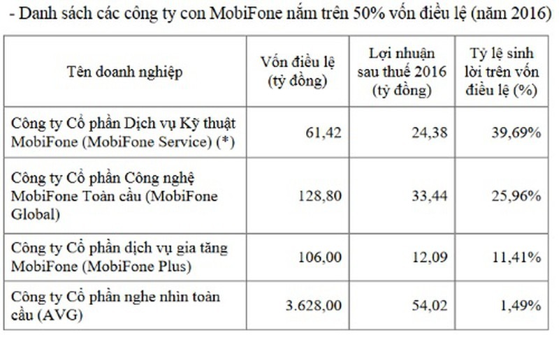 Theo MobiFone, 2016 là năm thành công với các công ty con khi đều mang lại lợi nhuận với tỷ suất sinh lời trên vốn điều lệ ở mức khá cao, điển hình là tại MobiFone Service đạt tới 39.69%, tại MobiFone Global là 25.96%.