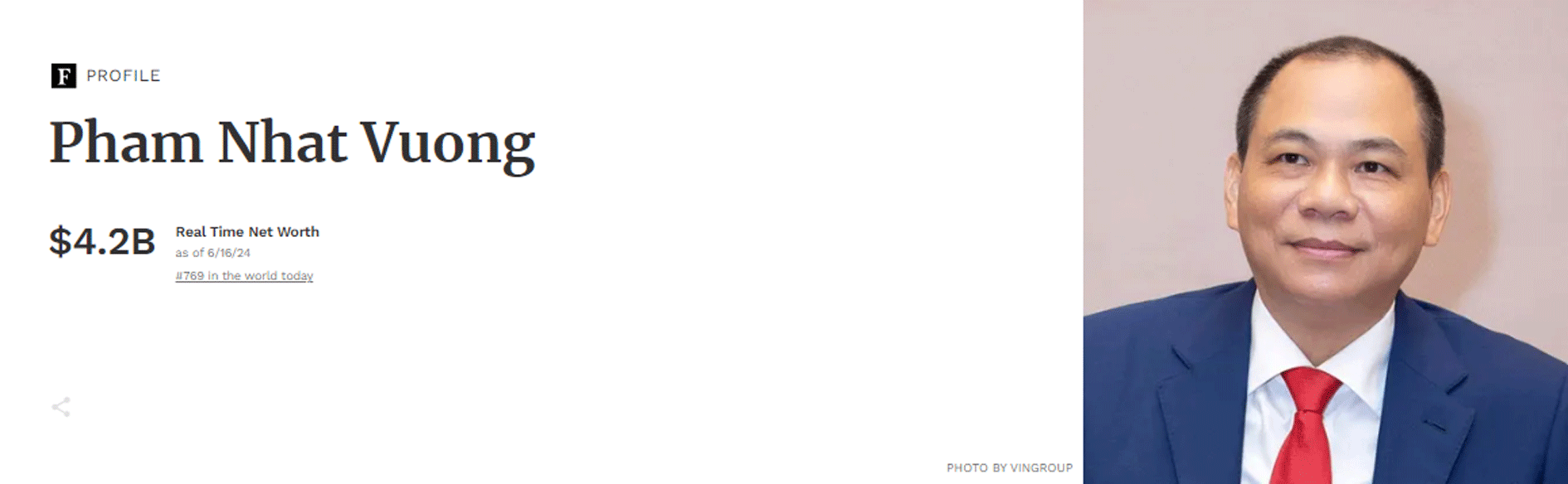 Còn theo Forbes, tính tới ngày 16/6, ông Vượng có khối tài sản là 4,2 tỷ USD.