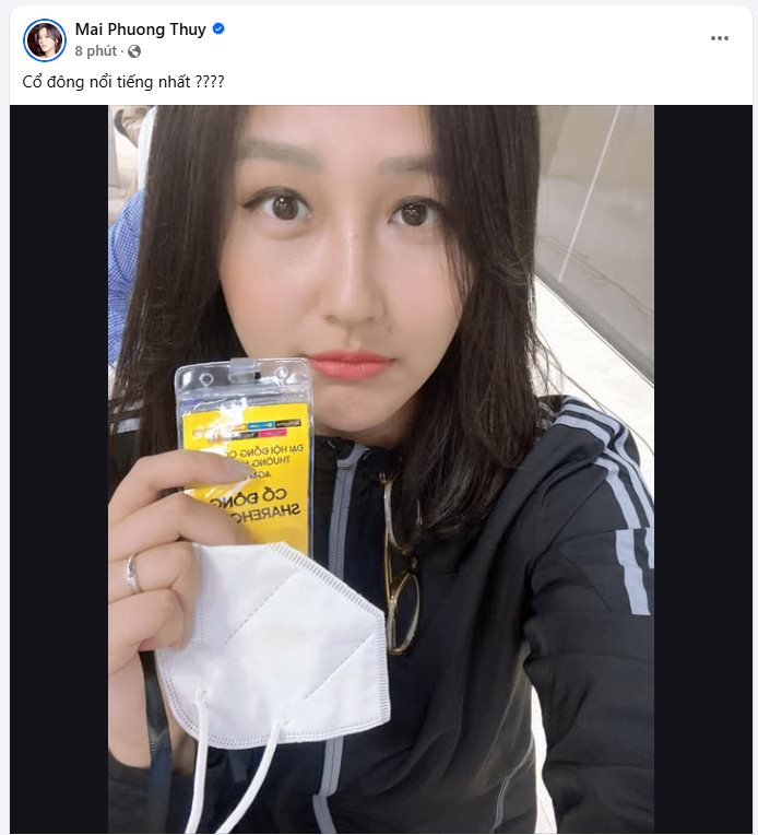 Trong một động thái mới nhất trên trang Facebook cá nhân, hoa hậu Mai Phương Thúy vừa chia sẻ hình ảnh góp mặt tại ĐHĐCĐ MWG với tấm thẻ cổ đông cùng dòng trạng thái: “Cổ đông nổi tiếng nhất ????”.