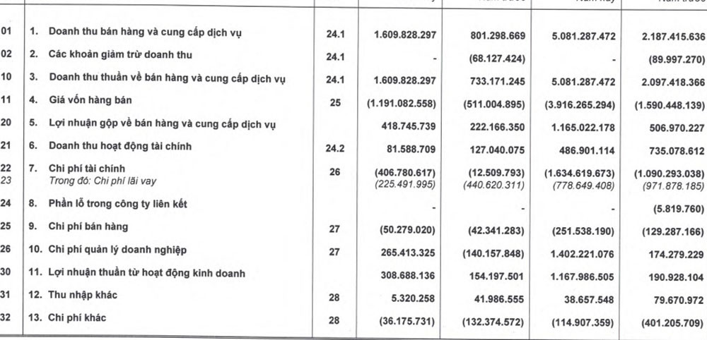 Trong năm 2022, HAGL ghi nhận lợi nhuận gộp đạt 1.165 tỷ đồng, nhưng chi phí tài chính lên tới hơn 1.634 tỷ đồng (trong đó, chi phí lãi vay gần 779 tỷ đồng). Doanh nghiệp cũng ghi nhận chi phí bán hàng hơn 251 tỷ đồng.