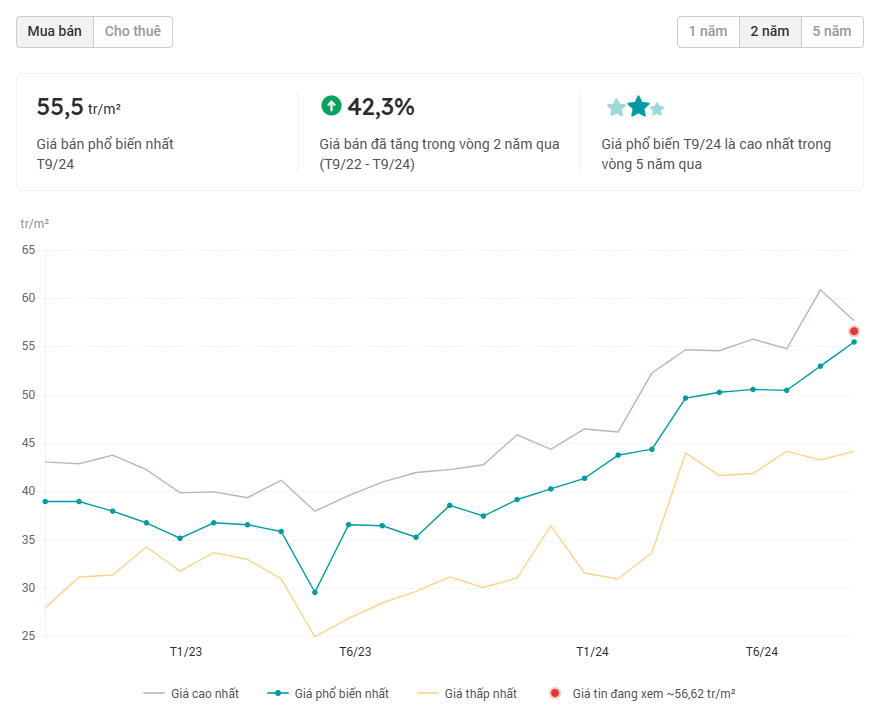 Khảo sát lịch sử biến động giá chung cư tại Rose Town 79 Ngọc Hồi, giá bán đã tăng trên 42,3% trong vòng 2 năm trở lại đây. Tính đến tháng 9/2024, giá bán phổ biến là khoảng 55,5 triệu đồng/m2. Đáng chú ý, có thời điểm bất ngờ giảm sâu là vào tháng 6/2023, giá dao động khoảng từ 25 - 38 triệu đồng/m2, tuy nhiên, sau đó nhanh chóng bật tăng trở lại và chưa có dấu hiệu chững lại.