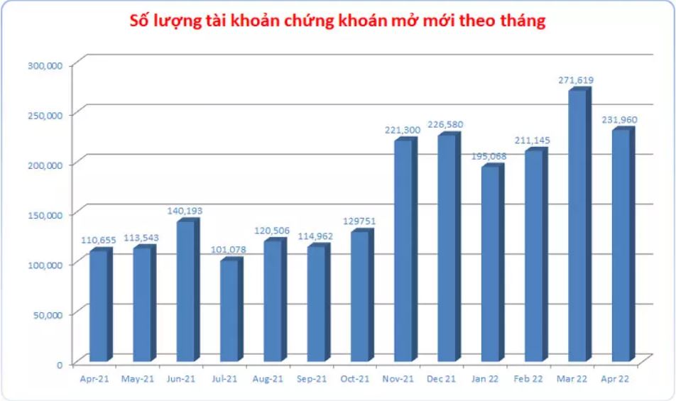 Số liệu từ Trung tâm lưu ký Chứng khoán Việt Nam (VSD) cho thấy, trong tháng 4, các nhà đầu tư trong nước đã mở mới 231.960 tài khoản chứng khoán, trong đó các nhà đầu tư cá nhân mở mới 231.782 tài khoản. Số lượng tài khoản do nhà đầu tư tổ chức mở là 178.