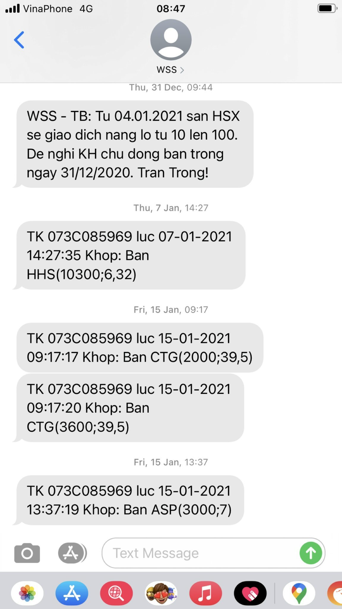 Ông Lê Trường Giang sau đó chuyển tiền vào tài khoản 073C085969 và có giao dịch mua bán chứng khoán. Các giao dịch được khớp lệnh mua bán được gửi qua tin nhắn điện thoại.