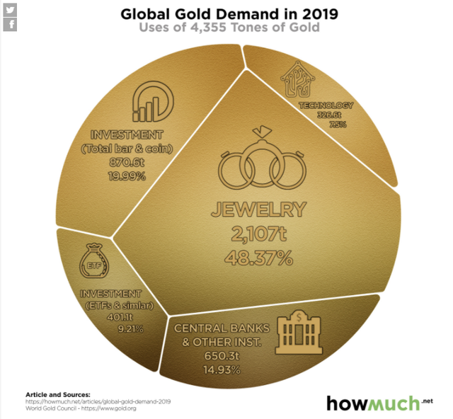 Dữ liệu từ Hội đồng Vàng Thế giới (World Gold Council) đã chỉ ra sự phân bổ nhu cầu vàng thường niên trên toàn cầu (tính đến Quý 4/2019). Cụ thể, vàng được sử dụng vào 5 mục đích phổ biến nhất: