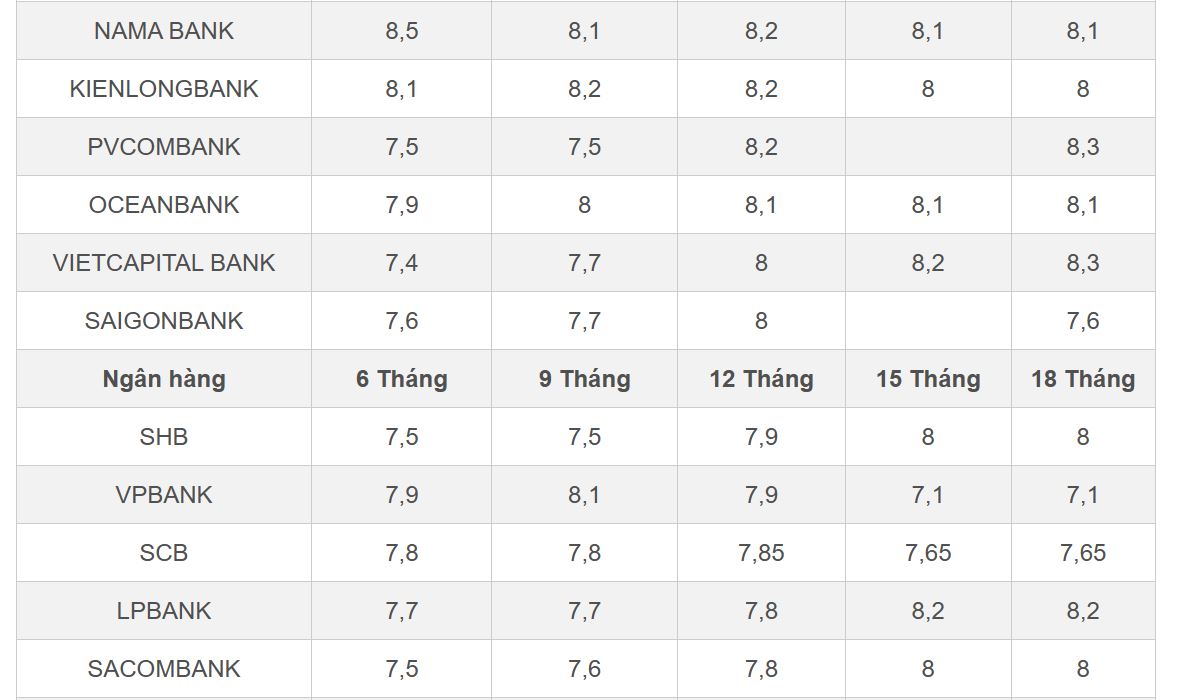 Lãi suất huy động kỳ hạn 18 tháng giảm mạnh từ 9,1% xuống chỉ còn 7,9%/năm. Đây cũng là mức lãi suất huy động các kỳ hạn từ 18 tháng trở lên.