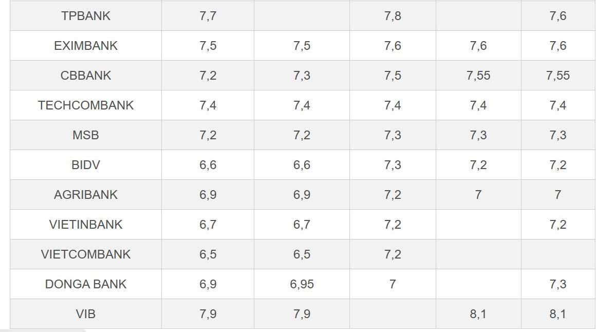 Trong khi đó, lãi suất huy động kỳ hạn 10 đến 13 tháng giảm từ 8,4% xuống chỉ còn 7,9%/năm. Các kỳ hạn từ 15 tháng trở lên giảm nhẹ từ 7,2% xuống còn 7,1%/năm.