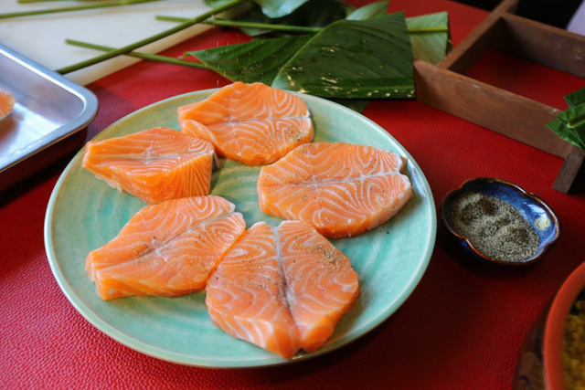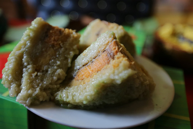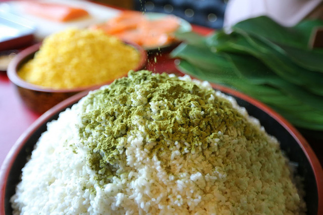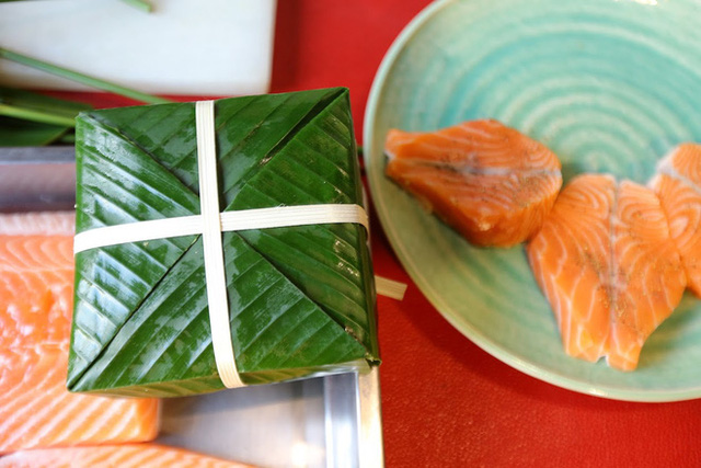 Tuy được gói và luộc theo cách truyền thống nhưng nguyên liệu chiếc bánh chưng nhân cá hồi đã biến tấu toàn bộ phần nhân bên trong, màu xanh của bánh được tạo từ bột trà xanh khá độc đáo.