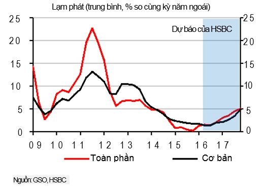 HSBC dự báo lạm phát toàn phần sẽ đạt ngưỡng mục tiêu 5% của Nhà nước vào cuối nửa đầu năm 2017.