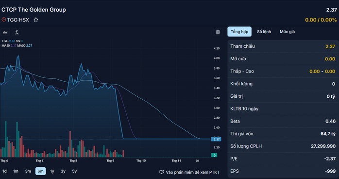 Theo ghi nhận, cổ phiếu TGG "dậm chân tại chỗ" hơn 2 tháng qua ở mức 2.370 đồng/cổ phiếu. Vào tháng 9-2021, cổ phiếu TGG từng chạm đỉnh 74.800 đồng/cổ phiếu. Như vậy, sau hơn 2 năm, giá cổ phiếu này đã giảm gần 97%.