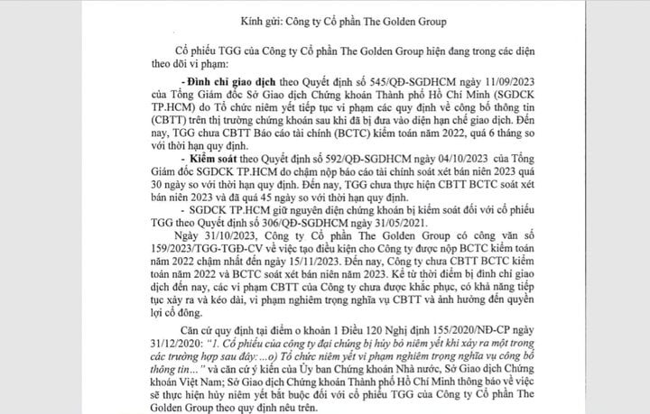 Ngày 31-10, Công ty CP The Golden Group đã có công văn gửi đến HoSE về việc tạo điều kiện nộp báo cáo tài chính kiểm toán năm 2022 chậm nhất vào ngày 15-11. The Golden Group cũng chưa công bố thông tin báo cáo tài chính kiểm toán năm 2022 và báo cáo tài chính soát xét bán niên năm 2023.
