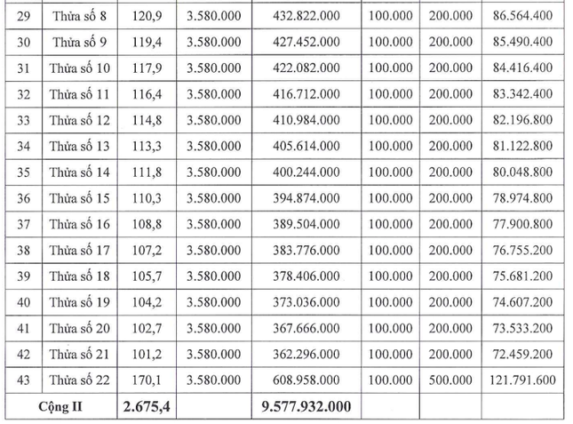 Tuy nhiên, đến ngày 16/8, Công ty đấu giá hợp danh Việt Nam có thông báo tổ chức lại phiên đấu giá này, dự kiến vào sáng 8/9. Theo đó, các thửa đất có diện tích dao động từ 74,63 - 134,69 m2, giá khởi điểm tăng lên 8,8 triệu đồng/m2, tương đương từ 660 triệu đồng đến gần 1,2 tỷ đồng/thửa.