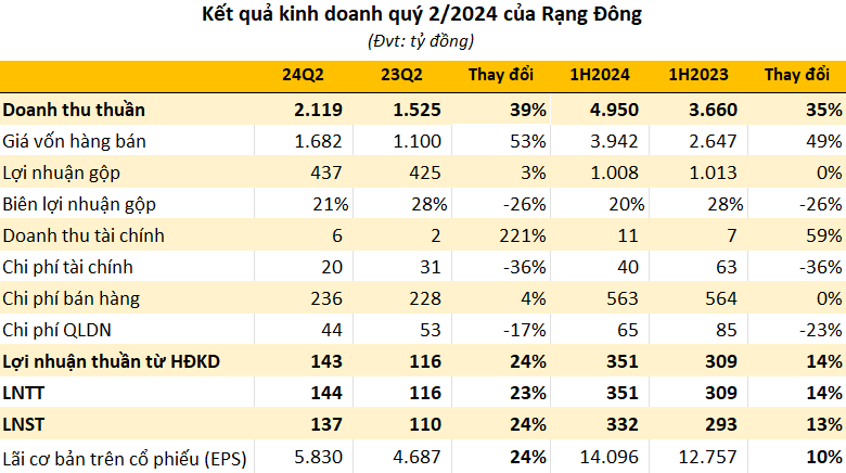 Lũy kế 6 tháng đầu năm 2024, doanh thu thuần tăng trưởng 35% so với cùng kỳ lên 4.950 tỷ, biên lãi gộp đạt 30%. Khấu trừ các chi phí, lãi trước thuế của RAL tăng 14% lên 351 tỷ đồng. EPS 6 tháng đạt 14.096 đồng - top đầu sàn chứng khoán.