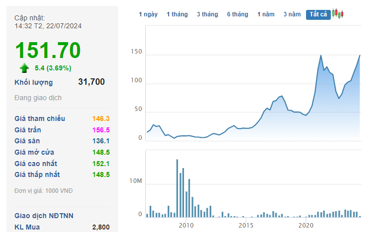 Trên thị trường, giá cổ phiếu RAL vẫn đang trong đà tăng tốt; hiện đang giao dịch quanh mức 151.700 đồng/cp - vùng giá cao nhất trong vòng hơn 1 năm trở lại đây và chỉ cách đỉnh lịch sử khoảng 7% giá trị. Tính từ đầu năm 2024, cổ phiếu này tăng 42%, vốn hóa thị trường xấp xỉ 3.600 tỷ đồng.