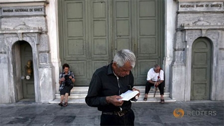 Người dân chờ nhận lương hưu tại chi nhánh Ngân hàng quốc gia ở Athens Ảnh: Reuters |