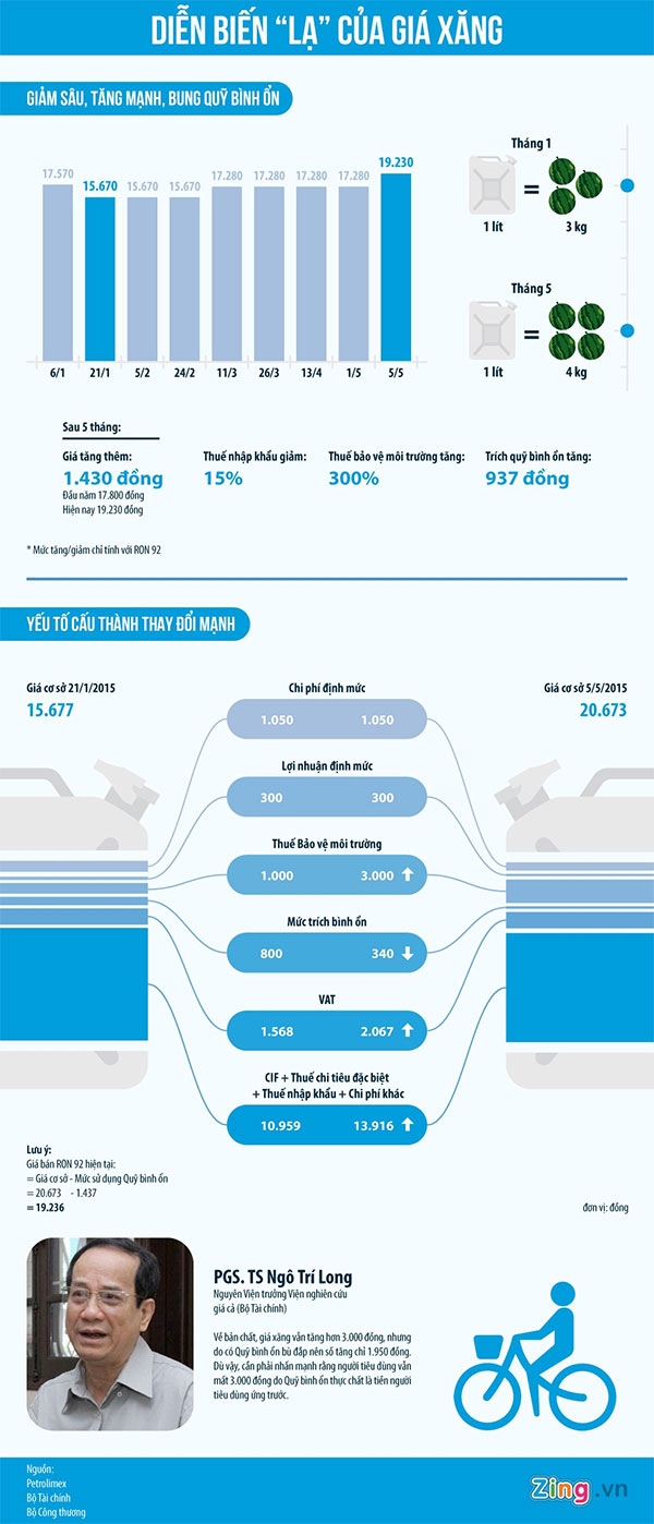08/05/2015 00:19[Infographic] 5 tháng giảm sâu, tăng mạnh của giá xăng