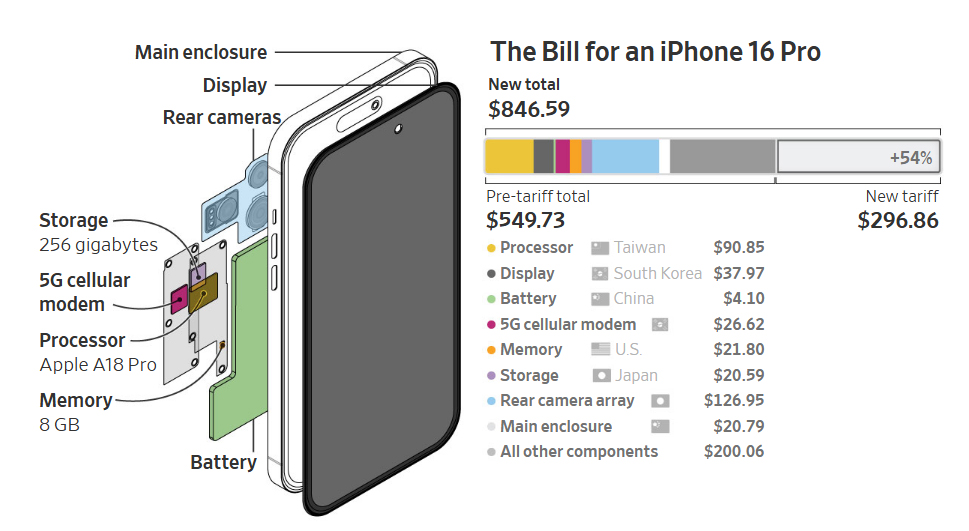 Một chiếc iPhone 16 Pro Max, với màn hình 6,9 inch và dung lượng lưu trữ 1Tb, hiện đang bán lẻ ở mức 1.599 USD, có thể có giá gần 2.300 USD - tức là tăng thêm 701 USD (tương đương hơn 18 triệu đồng) nếu Apple để người dùng gánh chi phí.