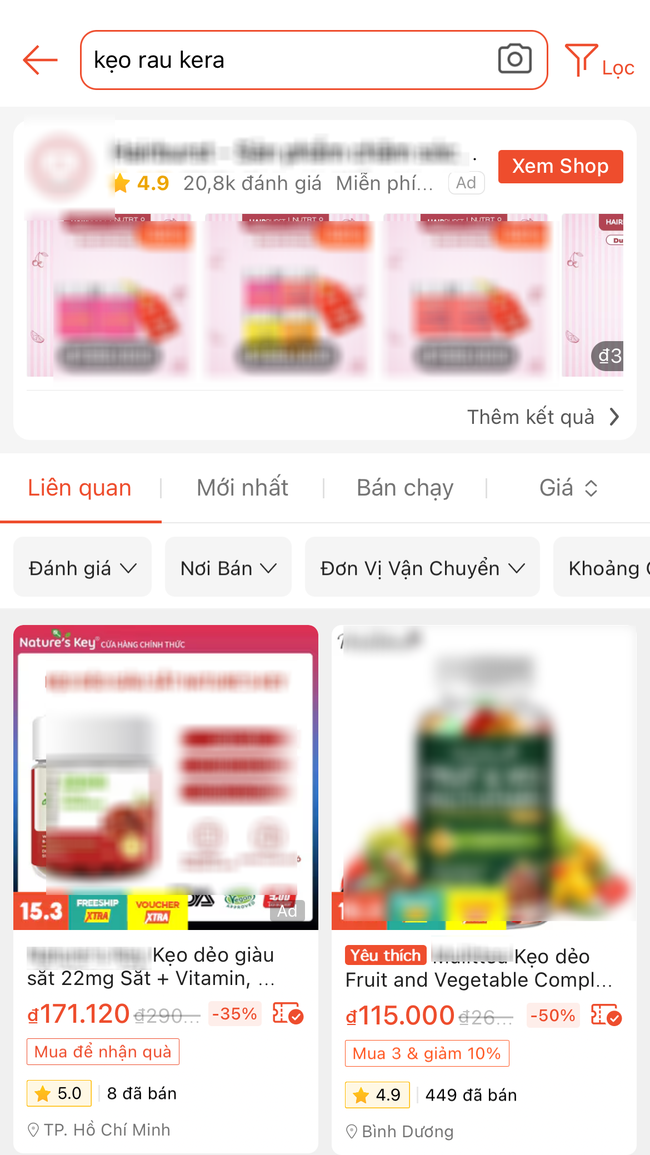 Tìm kiếm trên các sàn TMĐT, dù tìm kiếm sản phẩm "kẹo rau KERA" nhưng kết quả lại cho ra một loạt sản phẩm khác, chứ không hề có bóng dáng của hộp kẹo này.