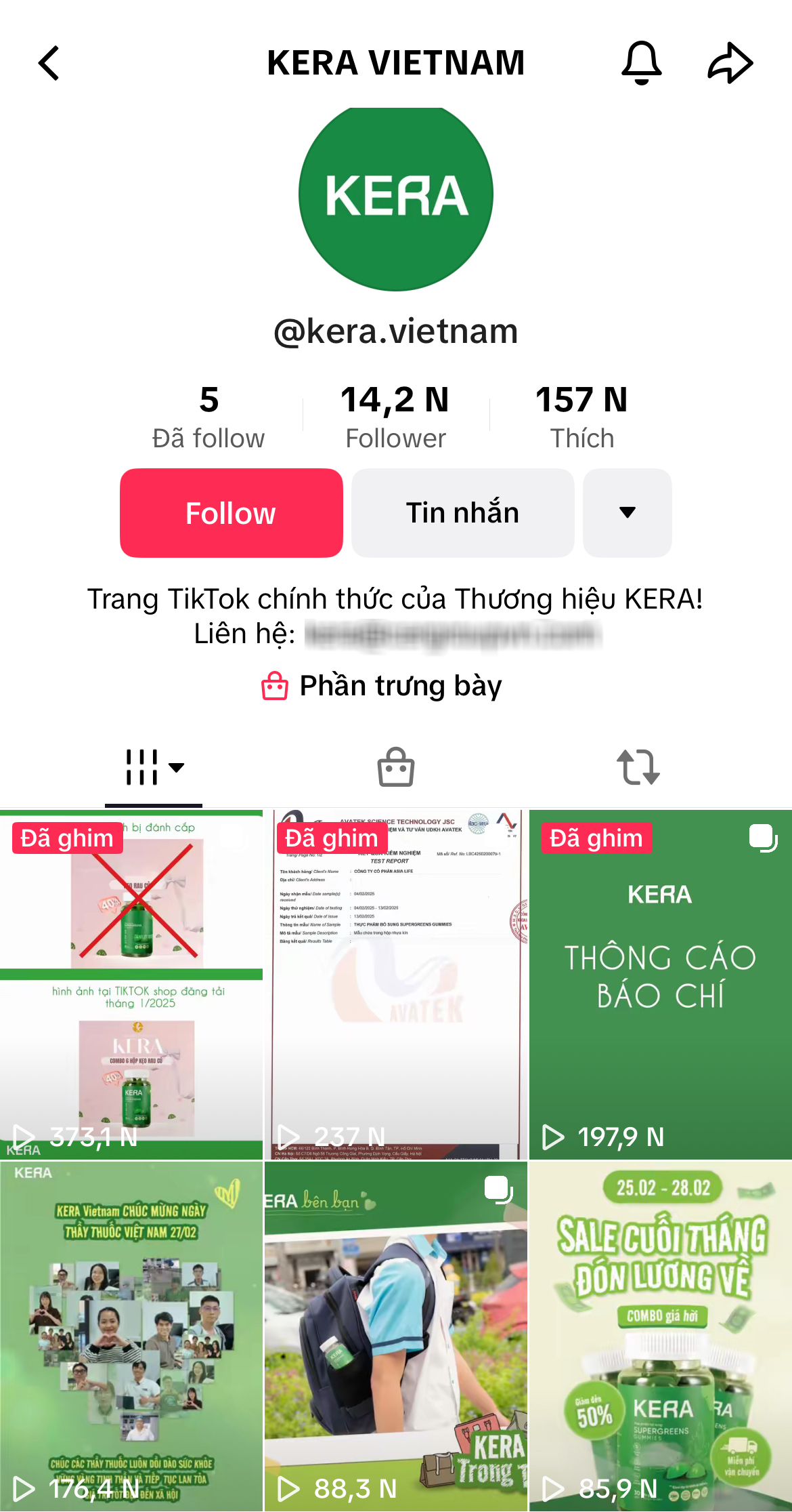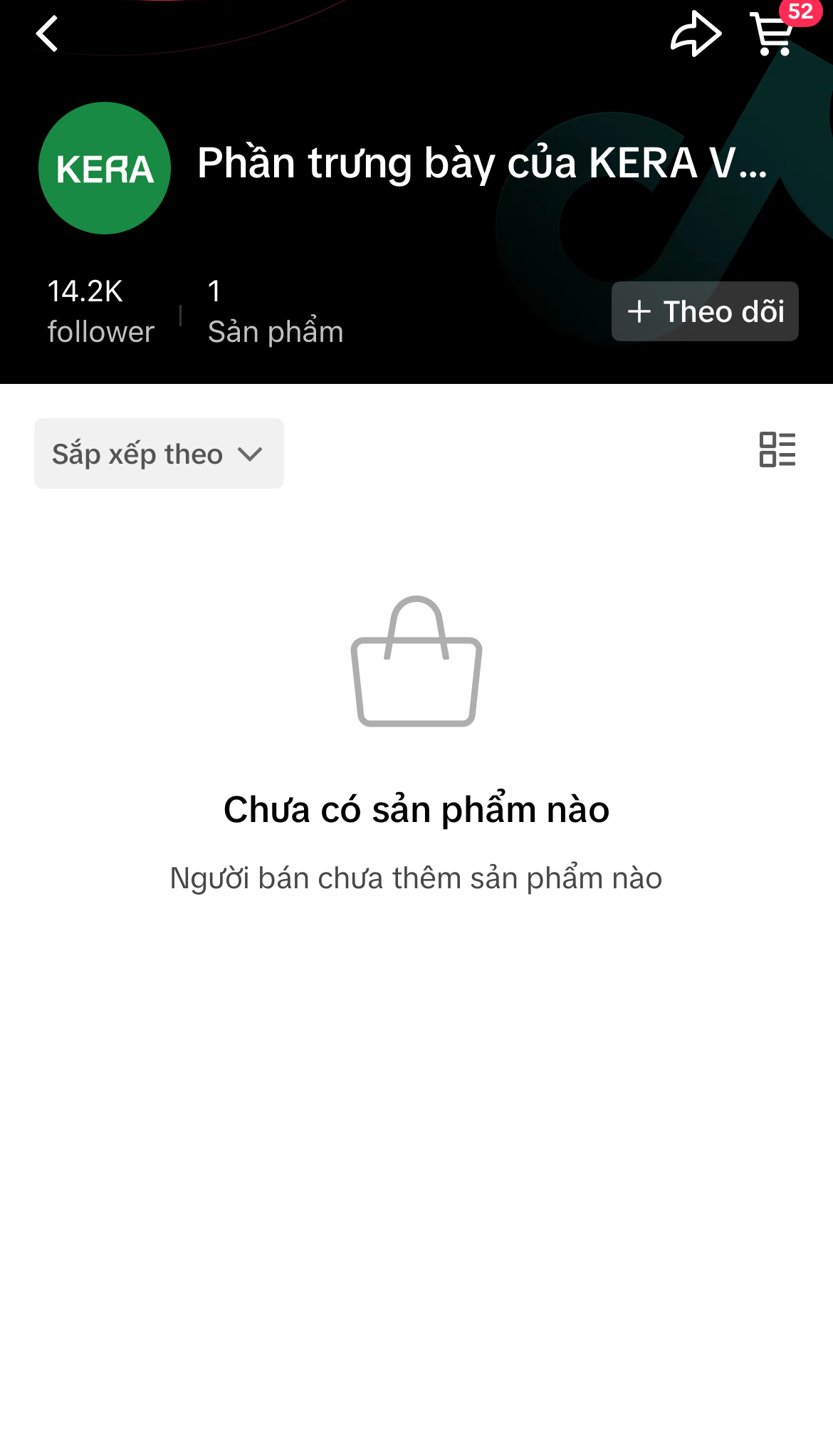 Trên kênh TikTok chính thức của thương hiệu KERA, mặc dù có tới 157 nghìn lượt thích và 14,2 nghìn người theo dõi, nhưng trong phần giỏ hàng lại không hề thấy bất kỳ một sản phẩm nào kể cả kẹo rau KERA.