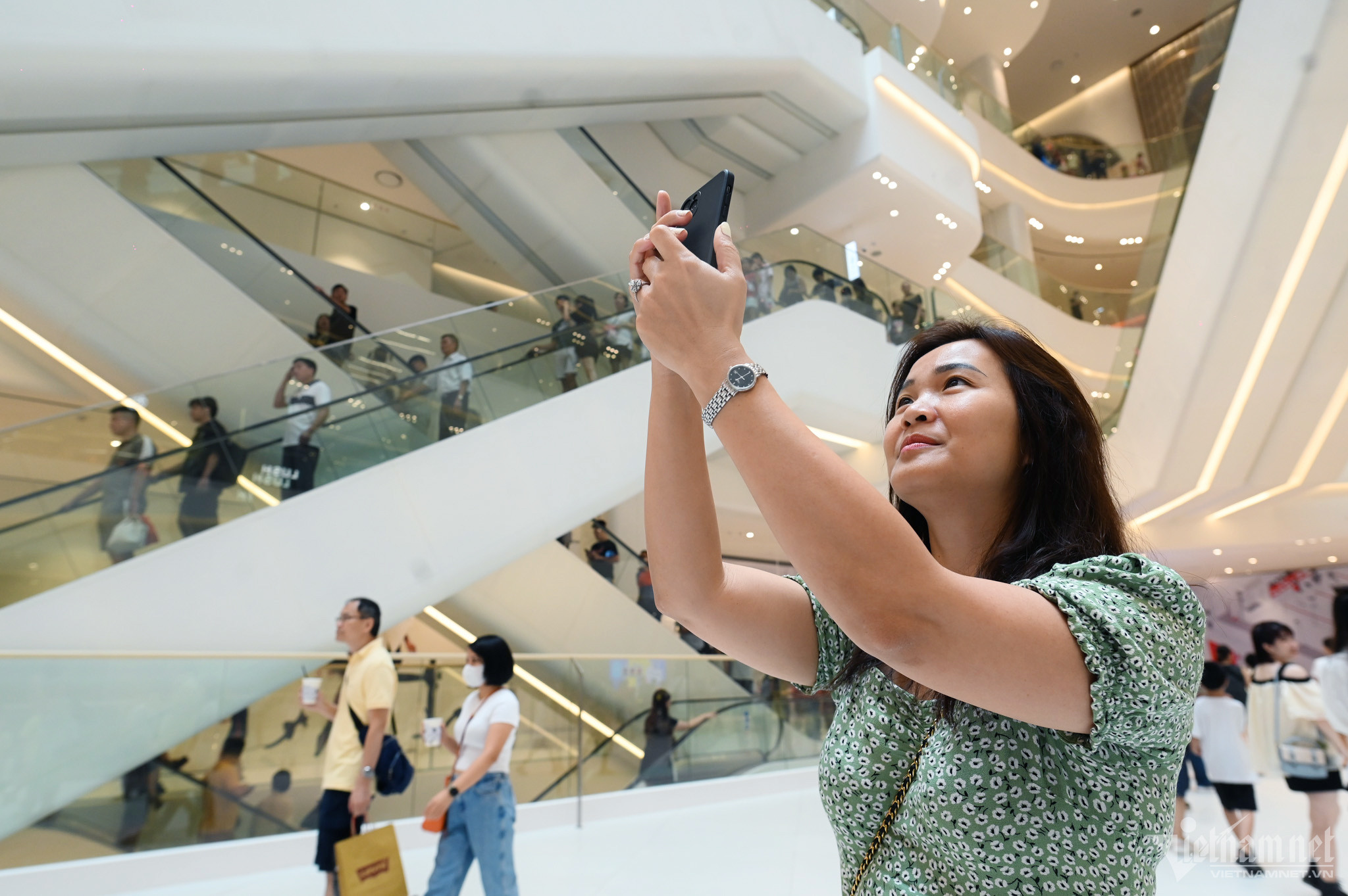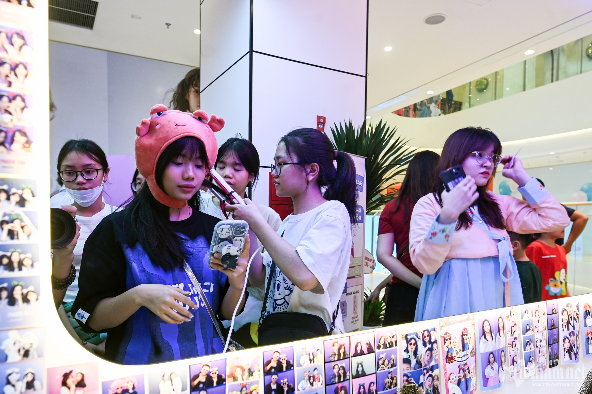 Tại khu vực dịch vụ chụp ảnh, hàng chục người đứng ngồi quây kín. Phương Thảo (trái) cho biết cô và nhóm bạn tranh thủ đến TTTM này chơi cuối tuần vì gần nhà. "Em thấy không gian rất rộng, sau này đi vào hoạt động chính thức, hoàn thiện dịch vụ tiện ích rồi có lẽ đây sẽ là điểm đến lý tưởng", Thảo chia sẻ.