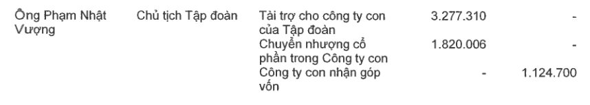 Ngoài khoản hỗ trợ, Chủ tịch Vingroup có giao dịch chuyển nhượng cổ phần công ty con với quy mô hơn 1.800 tỷ đồng. Đồng thời, ông tiếp tục không nhận thù lao tại tập đoàn này, tương tự những năm gần đây.