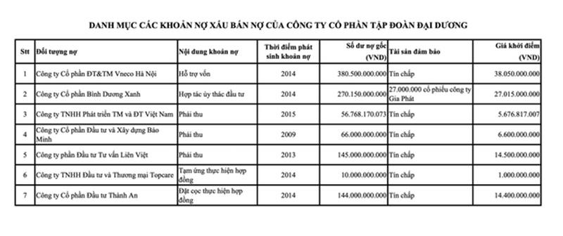 Ocean Group sẽ thực hiện bán 7 khoản nợ với tổng số dư nợ gốc lên tới hơn 1.072 tỷ đồng, tiêu biểu là khoản nợ tín chấp với nội dung hỗ trợ vốn, giá trị 380,5 tỷ đồng của CTCP ĐT&TM Vneco Hà Nội phát sinh từ năm 2014; khoản nợ hợp tác ủy thác đầu tư giá trị 270 tỷ đồng của Công ty Cổ phần Bình Dương Xanh phát sinh năm 2014 có tài sản đảm bảo là 27 triệu cổ phiếu công ty Gia Phát; khoản nợ phải thu 145 tỷ đồng của Công ty phần Đầu tư Tư vấn Liên Việt phát sinh năm 2013.