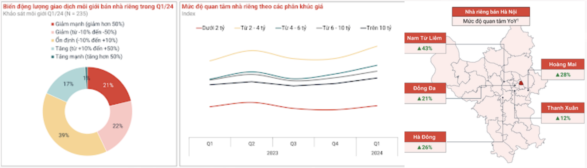 Thống kê của batdongsan.com.vn cho thấy mức độ quan tâm và giao dịch loại hình Nhà riêng tại Hà Nội dần cải thiện trong quý 1/2024. Đặc biệt, mức độ quan tâm cải thiện rõ rệt ở một số quận ngoại thành khi các quận trung tâm không còn nhiều lựa chọn.