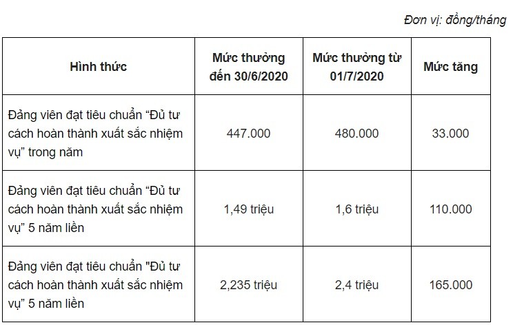 Trong đó, trong năm 2020, lương cơ sở tăng thì mức khen thưởng định kỳ của Đảng viên cũng tăng theo gồm: