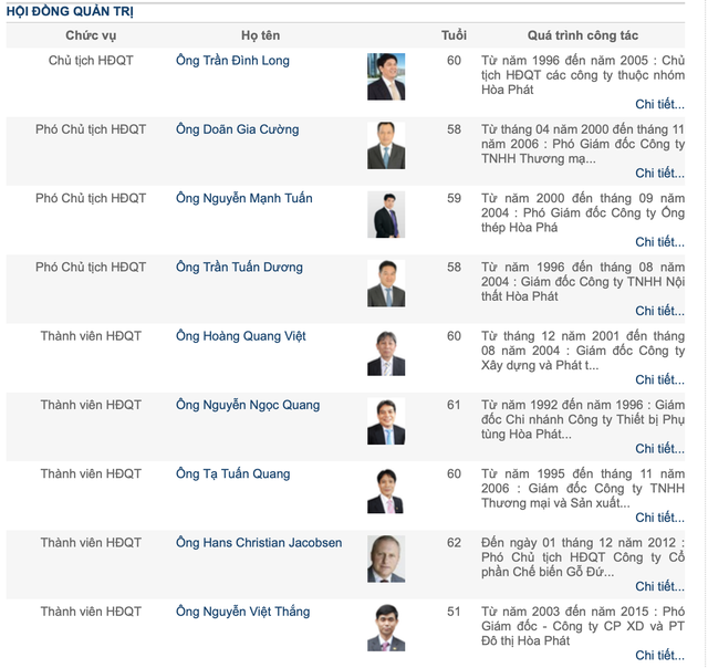 Hội đồng quản trị của Hoà Phát có 9 thành viên bao gồm Chủ tịch Trần Đình Long, 3 Phó Chủ tịch HĐQT là ông Trần Tuấn Dương kiêm Tổng giám đốc, ông Doãn Gia Cường, ông Nguyễn Mạnh Tuấn, 5 thành viên là ông Hoàng Quang Việt, ông Nguyễn Ngọc Quang, ông Tạ Tuấn Quang, ông Nguyễn Việt Thắng và ông Hans Christian Jacobsen, Tổng giám đốc của Bank Invest đại diện cho quỹ PENM.