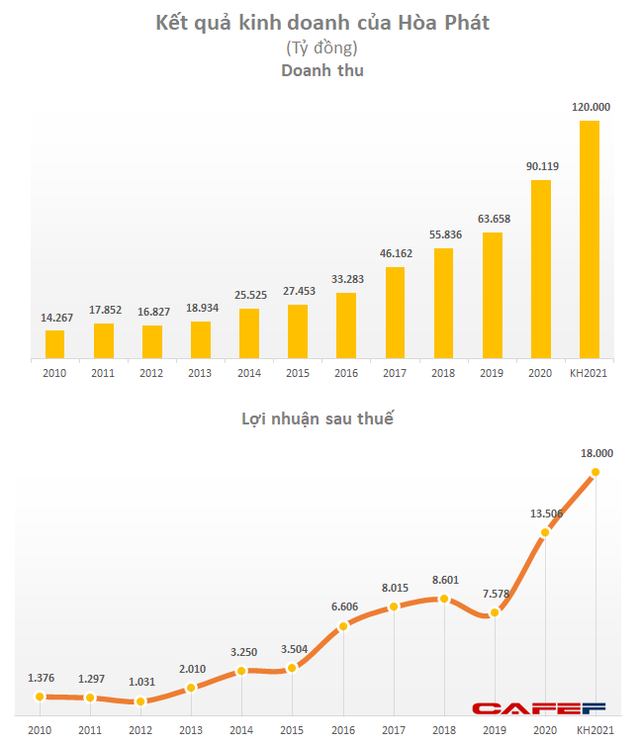 Báo cáo kiểm toán năm 2020 của Tập đoàn Hoà Phát cho thấy doanh thu và lợi nhuận năm 2020 của tập đoàn lập đỉnh lịch sử, lần lượt đạt 91.279 tỷ đồng và 13.506 tỷ đồng, tăng lần lượt 41% và 78% so với năm 2019.
