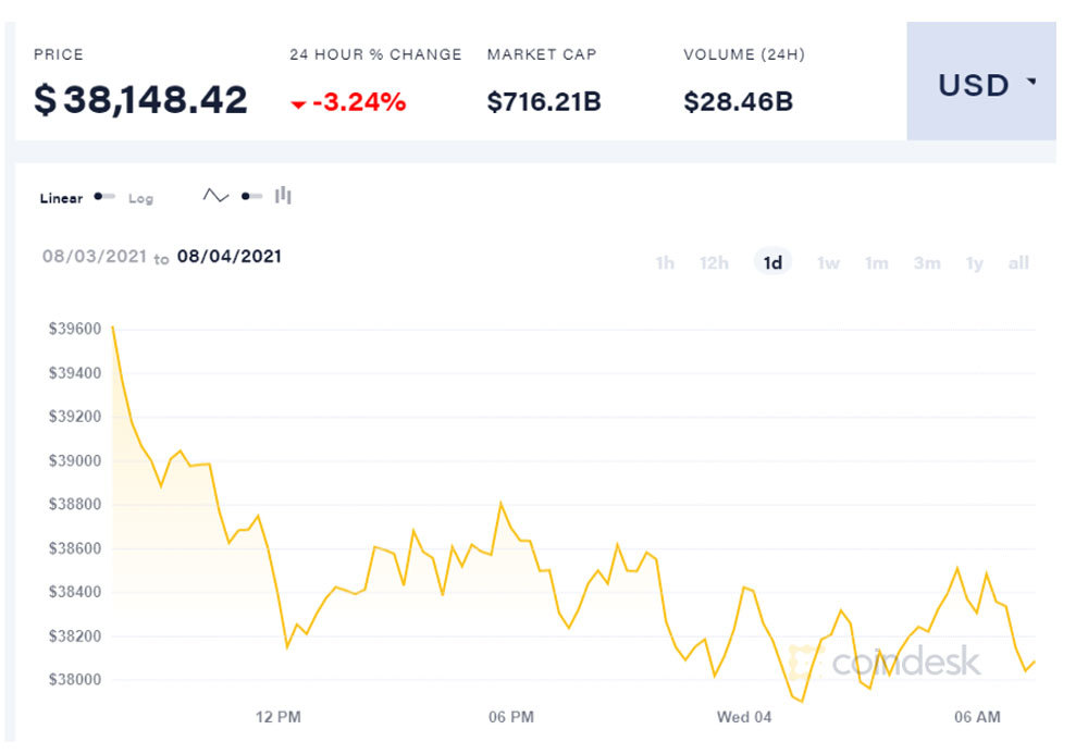 Dữ liệu của CoinDesk vào 7h30' hôm nay (giờ Việt Nam) cho thấy, giá Bitcoin được giao dịch ở mức 38.148,42 USD, giảm 3,24% so với ngày hôm qua. Trong 24 giờ qua, giá Bitcoin thời điểm cao nhất đạt 39.789,64 USD, thấp nhất ở mức 37.695,09 USD.
