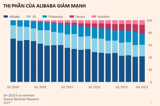 Nhưng tài khoản của Alibaba cho thấy năm ngoái nguồn doanh thu này thấp hơn 4% so với mức đỉnh năm 2021. Các nhà phân tích tại nhóm nghiên cứu Bernstein ước tính rằng thị phần của tập đoàn này trong miếng bánh thương mại điện tử của Trung Quốc đã giảm từ 68% vào năm 2019 xuống còn 42% vào năm 2023. "Những sáng kiến mà họ thực hiện cho đến nay vẫn chưa ngăn được sự trượt dốc thị phần", chuyên gia Robin Chu của Bernstein lưu ý.