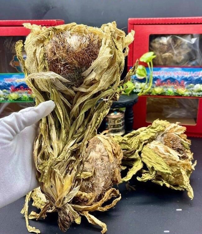 Hoa sen tuyết là vị thuốc bổ và dược liệu cao cấp có thể trị thận hư, đau thắt lưng, trừ phong thấp, giúp thông kinh, hoạt huyết. Hoa sen tuyết Thiên Sơn thường được thu hoạch khi bung nở vào tháng 7 - tháng 8 hàng năm. Sau khi thu hái, hoa được đem phơi nắng một thời gian để giữ dược tính của hoa.
