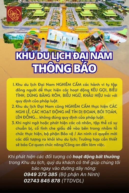 Ngày 26/6, trên trang fanpage chính thức, Khu du lịch Đại Nam thuộc sở hữu của Công ty Cổ phần Đại Nam, do ông Huỳnh Uy Dũng và vợ là bà Nguyễn Phương Hằng đứng đầu vừa đưa ra thông báo nhằm đảm bảo an ninh, trật tự và môi trường tham quan văn minh.